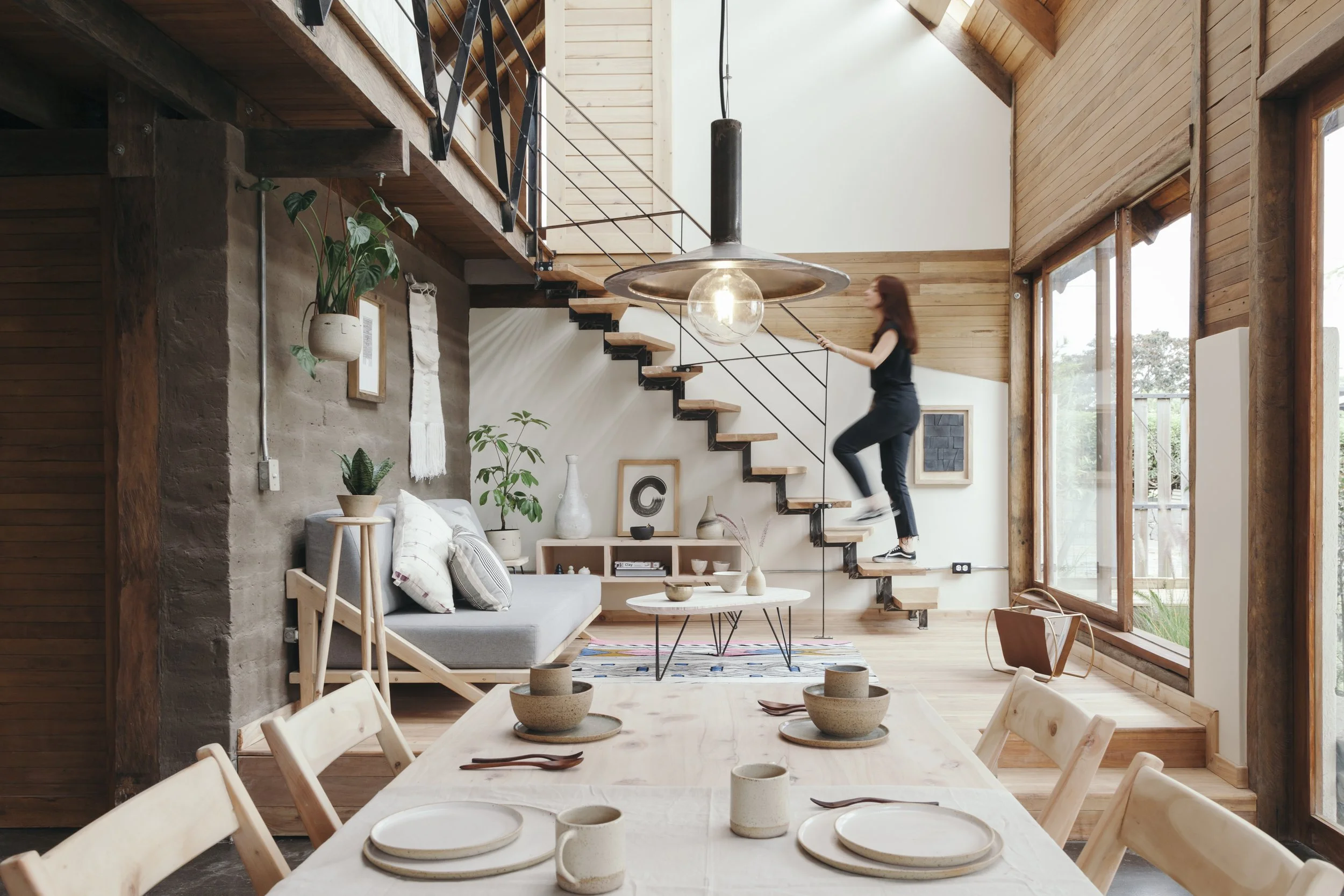 Sala de interior con escalera de metal y madera, decorada con plantas y arte en las paredes, con una mesa de comedor de madera y platos, taza y utensilios, y una mujer subiendo las escaleras.